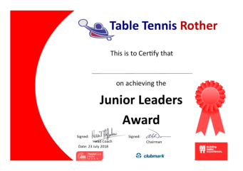 Our Primary Table Tennis Leadership Award will help you improve both your knowledge of table tennis as well as helping you to develop leadership skills which you will find useful as you get older.The Award involves completing a number of activities which you can do in your own time. You will be given plenty of opportunities to complete these tasks during your school club but there might be a task or two that you will need to complete at home.During the award you will learn the basic rules of the game, the strokes that make up the game, organise some small competitions as well as umpiring and helping others in your club that might need some help.After you have completed your tasks successfully you will receive our special certificate to mark this special occasion and become a Table Tennis Rother Official Primary Table Tennis Leader.There are other awards you can take as you get older. These include our Junior Table Tennis Leaders Award, Table Tennis England’s Junior Umpire Award.